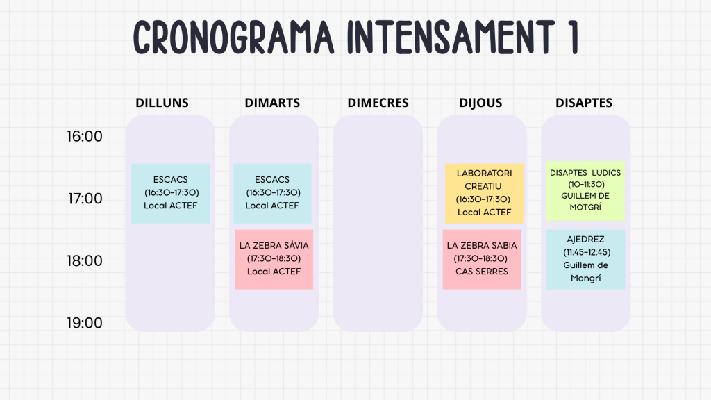 Grup 1 dilluns o dimarts de 16.30h a 17.30h