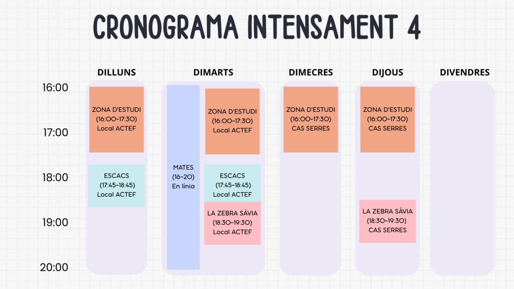 Aquest taller consisteix en un primer trimestre sessions estructurades on s’ensenyen i practiquen diferents estratègies per a millorar la capacitat d’estudi de manera eficient i individualitzada i continuarà els següents trimestres amb un acompanyament en els estudis. L’enfocament està a personalitzar el procés d’aprenentatge, tenint en compte les necessitats, l’estil d’aprenentatge i els objectius de cada persona.